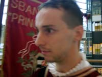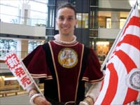 | のぼりをもってにっこりするイーヴォさん(イタリアチャンピオン、ローマ法王の前で演技したすごい人) |