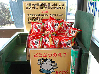 牛の絵が描いてあるのにやぎのえさ。エビせんなのにやぎのえさ。しかもミニサイズで100円か……割り切れないものが残ります。でもやぎにえさをやる楽しさに比べれば見合うのかしら。いや、やぎにえさをやって楽しいのかしら。うーむ。(DPZ・大塚)