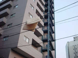 ふとん干し・良くない例 (by まりぞうさん)(https://www.hitobito.net/np/suit.html) まあ、よく乾きそうではありますが…。近所だったので、停電にならないかどうかどきどきしました。