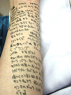 芳一ちっく。 (by かえるさん)(https://www.geocities.co.jp/AnimalPark/2978/) とあるライブの曲目やアーティストの発言等をスマート(?)に記録しておく方法として自分の腕をチョイス。滲まないうちに写真を、と、急いで電車の中で撮影。周囲の人は形容しがたい目で私を見ていました。