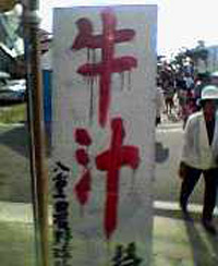 うまいのか? (by ざくろさん) 去年の石垣島祭りで地元の高校生が出していたお店です。周りが楽しげにやってる中、道沿いのこの看板だけがものすごく大きく(150cmほど)、おどろおどろしい雰囲気は、まるでお化け屋敷の看板。牛汁は沖縄の食堂ではポピュラーなメニューです。