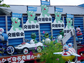 無事カエル (by 全日本弥七の会会長さん)(https://members.tripod.co.jp/yasiti_87/) 稚内市の海岸沿いに、どなたかが"うき"を加工したドラえもんやらカエルやらを展示し、安全を呼びかけています。この写真は氷山の一角。ウジャウジャいるので気を取られてハンドル操作を誤りそうです。