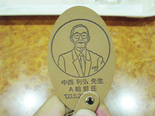 父の同窓会記念品、担任の似顔絵入りキーホルダー。