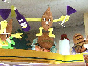 クロワッさん (by 薬缶さん)(https://www5e.biglobe.ne.jp/~takettle/) スーパーの肉売り場の上にいる、ワインを持ったパンさん。鼻高々です。
