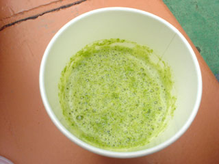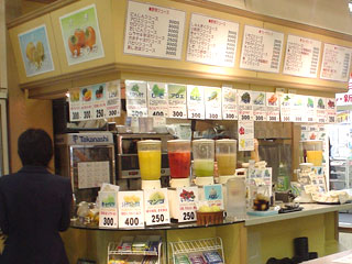 ジュースは果物が常時ミキサーに入るほかにメニューに小松菜、ブロッコリー、大根と手加減なしの野菜がラインナップ。優しげなおじさんがその場でプロセッサーにスリコギを突っ込んで野菜をジュースにしていた。どうなんだろうといぶかしがりつつも「胃に効く」というブロッコリーを頼んでみた。