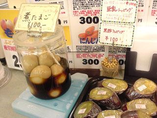 「ベジタリアン」のほうは南国風の内装に制服の店員さんと、とっつきやすい雰囲気。対して「オザワフルーツ」は良い意味でごちゃっとしていて いかにもの雰囲気だ。私は迷わずオザワさんのほうを選んだ。だって、レジ前にあるのが「煮たまご 100円」に「ふかしいいも 80円」である。たまらない。