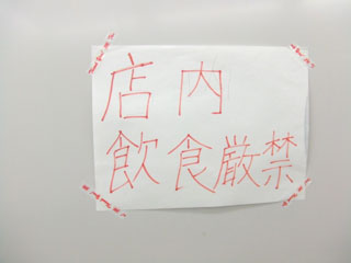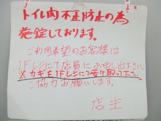 このお店はもう一つものすごいアトラクションが用意されていた。中2階の奥(レジからもっとも遠い場所)にトイレがあるのだが、店員の監視が行き届かない場所にあるのか、左のような貼り紙が貼ってあった。