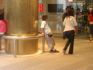 さてさらに見続けていると、この場所を単なる待ち合わせに使うには不似合いな人種が。それは子ども。彼も先に書いた、男なら誰もが経験したことある「お母さん、まだ〜」の類だろう。見た感じ小学校中〜高学年、そんな多感な頃に109に入るのはかなりの抵抗があるに違いない。