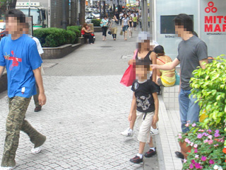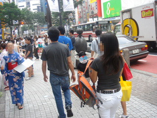 1時間近くウォッチしてみて、109の下で待っている人は1/3が難民の類、1/3がタバコ、1/3が待ち合わせ場所として、だった。しかし家族、これはどれにも当てはまらない。黄色いトートを持った父親と長男と長女、この日は蒸し暑かっただけに当然ストレスの矢面に立つのはお父さん。