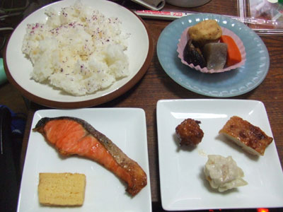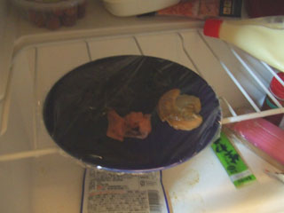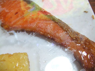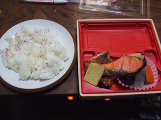 次に鮭とたまご。あたため終わると鮭はじゅーっと音をたてていた。うまそうだったのでラップのうえから写真を撮った。おいしそうなじゅーが伝わるだろうか。いつものコンビニ弁当のあたためではあまり見かけない光景だ。