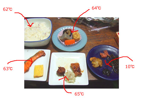 同様にあたためていくと今度はにくの皿で大誤算。80℃近くまであたためてしまった。そこでにくの皿はアルミホイルをかけずに冷ますことに。