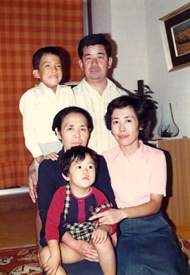 | 黒電話を使っていた頃の実家リビングにて。7才の頃の僕(左上)、父(右上)、祖母(左中)、弟(左下)、母(右下) |