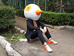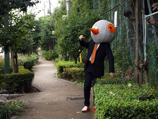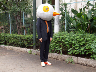 ハトはオレンジが差し色なので、ネクタイと靴をオレンジにしてみた。あ、申し遅れましたが、なかはわたくし、林です。ハト気分でうろうろしていたところ、植え込みにつっこんでしまった(このハトは前がよく見えないのだ。鳥目?)。