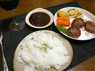 これはうまい。ハンバーグだけ食べると甘さがわかりますが、ソースを付けるとこれがいい塩梅です。問題なく食べられます。うっすら甘いご飯とも合い、食が進みます。甘くて美味い。これだよ、求めていたのは、これなんだよ!