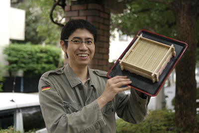 ざるそばのアレは見事に安定した。 これでもう、路地裏から猛犬が出てこようが逃走中の泥棒が飛び出してこようがそばを地面にぶちまける心配はない。 写真をご覧になって、おいおいそばが入っていないじゃないかとお思いかもしれないが、心配無用。 実際の出前の際には、そばにも入れ歯安定剤を塗っておけばよいのだ。もちろん薬味のネギにも。