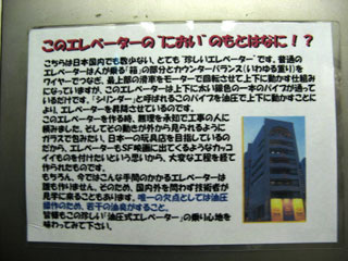 こうして1日かけて11箇所のエレベーターを回ったわけだが、エレベーターのにおいには大きく分けて3種類あるように思った。匂いの強い人が乗った、生ゴミを載せた、などなどの「中」の匂い。ビルが取り扱う商品、もしくは芳香剤など固有の何かの匂いが移った「モノ」の匂い。そして油圧式に代表されるエレベーター動力部など箱の外部、「外」の匂い。各々独立して、独特の匂いを発している。