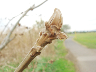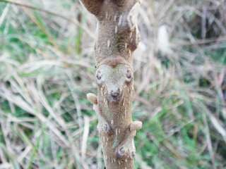 オニグルミの冬芽ちゃんは、葉痕の部分が大きいので自然とキャラクター全体が大きく感じられて見つけやすい。枝全体にひょこひょこたくさん顔がくっついているみたい。
