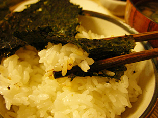 炙った海苔が今日のメインディッシュ。醤油をたっぷり染み込ませて、白いご飯を包んで食べる。