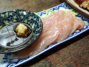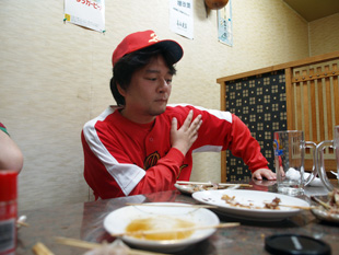 ユニフォームのまま今治名物の焼き鳥屋にむかう(今治は焼き鳥、しかも皮が名物でもある)。