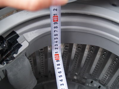 このスピードメーターは、ホイールに取り付けられたマグネットが回転する回数をセンサーで感知して、あらかじめ設定した自転車のホイール径をもとに速度を割り出し表示する仕組みだ。 なので、洗濯槽の直径を測ってメーターに入力しなければならない。 自転車用なので単位はインチだ。インチに計算しなおして入力する。