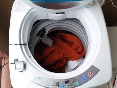 いよいよ計測だ。 よりリアルに速度を測定するために、実際の洗濯物を投入し、実験を開始する。