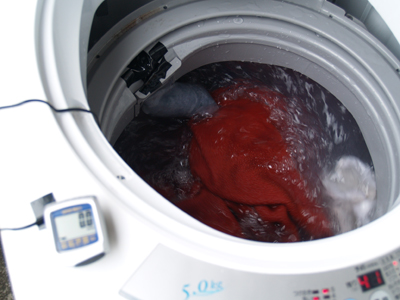 などと考えながら眺めていたら洗濯物の動きが止まり、水が排水口に流れ出した。 すすぎ行程の始まりだ。 排水が終わったら、再び水をはる前に脱水がある。 ついに速度計測である。