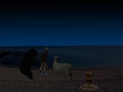 おともはペットのゴローくんです(やぎです)。偶然ですが、こんなところでくまを見ることができました。チョー感激です。ちなみに手前にうつっているのは遊びながら食べてたデザートです。うまいっす!