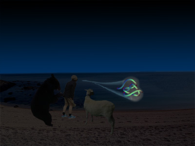 おともはペットのゴローくんです(やぎです)。偶然ですが、こんなところでくまを見ることができました。チョー感激です。手前に映ってる小さいのは遺伝子です。リラックスしてると見えるもんなんですね。
