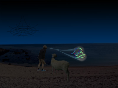 おともはペットのゴローくんです(やぎです)。よく見たら空にブラックホールがありました。うっかりビーチサンダルを吸い込まれてしまいました。残念!手前に映ってる小さいのは遺伝子です。リラックスしてると見えるもんなんですね。