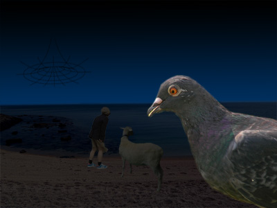 おともはペットのゴローくんです(やぎです)。よく見たら空にブラックホールがありました。うっかりビーチサンダルを吸い込まれてしまいました。残念!あ、ハトが写真に入ってしまいました。ハトってどこでもいますね。