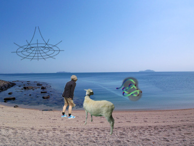 おともはペットのゴローくんです(やぎです)。よく見たら空にブラックホールがありました。うっかりビーチサンダルを吸い込まれてしまいました。残念!手前に映ってる小さいのは遺伝子です。リラックスしてると見えるもんなんですね。