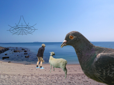 おともはペットのゴローくんです(やぎです)。よく見たら空にブラックホールがありました。うっかりビーチサンダルを吸い込まれてしまいました。残念!あ、ハトが写真に入ってしまいました。ハトってどこでもいますね。
