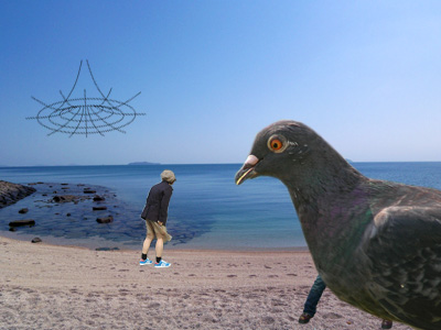 親戚の愉快なおじさんといっしょです。なんでこうなったのかは私にも不明です。よく見たら空にブラックホールがありました。うっかりビーチサンダルを吸い込まれてしまいました。残念!あ、ハトが写真に入ってしまいました。ハトってどこでもいますね。
