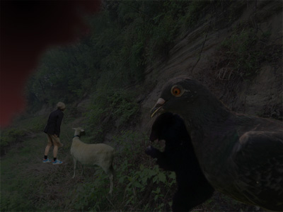 おともはペットのゴローくんです(やぎです)。偶然ですが、こんなところでくまを見ることができました。チョー感激です。あ、ハトが写真に入ってしまいました。ハトってどこでもいますね。