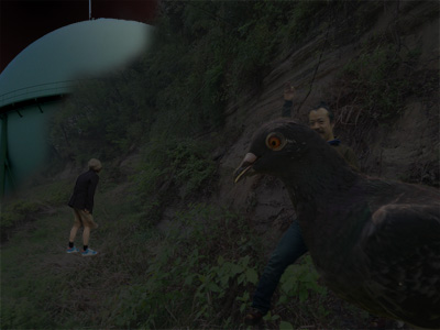 親戚の愉快なおじさんといっしょです。なんでこうなったのかは私にも不明です。遠くにガスタンクが見えたりして、まさに風光明媚。いうことなしです。あ、ハトが写真に入ってしまいました。ハトってどこでもいますね。