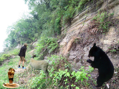 おともはペットのゴローくんです(やぎです)。偶然ですが、こんなところでくまを見ることができました。チョー感激です。ちなみに手前にうつっているのは遊びながら食べてたデザートです。うまいっす!