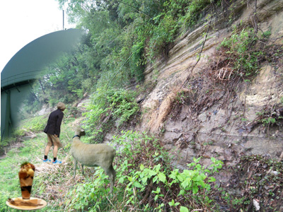 おともはペットのゴローくんです(やぎです)。遠くにガスタンクが見えたりして、まさに風光明媚。いうことなしです。ちなみに手前にうつっているのは遊びながら食べてたデザートです。うまいっす!