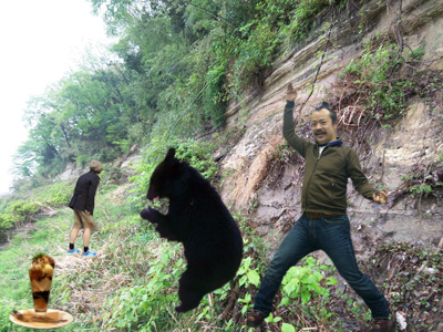 親戚の愉快なおじさんといっしょです。なんでこうなったのかは私にも不明です。偶然ですが、こんなところでくまを見ることができました。チョー感激です。ちなみに手前にうつっているのは遊びながら食べてたデザートです。うまいっす!