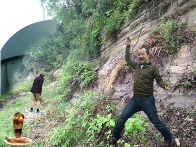 親戚の愉快なおじさんといっしょです。なんでこうなったのかは私にも不明です。遠くにガスタンクが見えたりして、まさに風光明媚。いうことなしです。ちなみに手前にうつっているのは遊びながら食べてたデザートです。うまいっす!