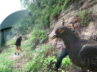 親戚の愉快なおじさんといっしょです。なんでこうなったのかは私にも不明です。遠くにガスタンクが見えたりして、まさに風光明媚。いうことなしです。あ、ハトが写真に入ってしまいました。ハトってどこでもいますね。