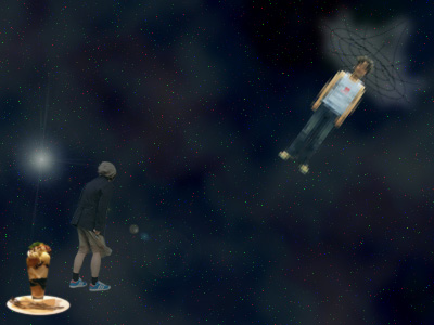 一緒に来ているのはテレビでも見たことがあるあのアイドルです。でもネットには出せないのでモザイクかけてます。ごめん!よく見たら空にブラックホールがありました。うっかりビーチサンダルを吸い込まれてしまいました。残念!ちなみに手前にうつっているのは遊びながら食べてたデザートです。うまいっす! では、そのうち戻りますのでおみやげをお楽しみに。私の仕事、終わらせておいてもらってもいいですよ。 |