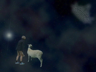 おともはペットのゴローくんです(やぎです)。よく見たら空にブラックホールがありました。うっかりビーチサンダルを吸い込まれてしまいました。残念!