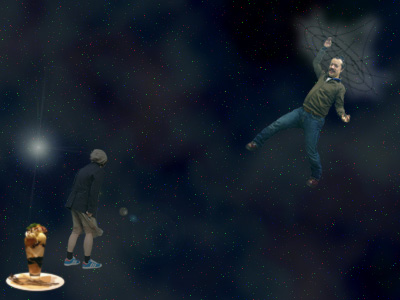 親戚の愉快なおじさんといっしょです。なんでこうなったのかは私にも不明です。よく見たら空にブラックホールがありました。うっかりビーチサンダルを吸い込まれてしまいました。残念!ちなみに手前にうつっているのは遊びながら食べてたデザートです。うまいっす!
