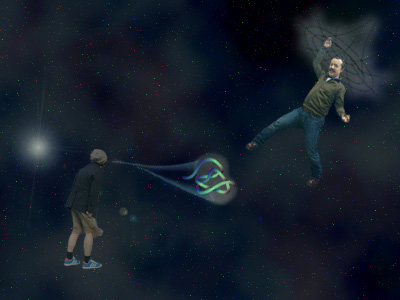 親戚の愉快なおじさんといっしょです。なんでこうなったのかは私にも不明です。よく見たら空にブラックホールがありました。うっかりビーチサンダルを吸い込まれてしまいました。残念!手前に映ってる小さいのは遺伝子です。リラックスしてると見えるもんなんですね。 では、そのうち戻りますのでおみやげをお楽しみに。私の仕事、終わらせておいてもらってもいいですよ。 |