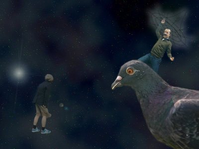 親戚の愉快なおじさんといっしょです。なんでこうなったのかは私にも不明です。よく見たら空にブラックホールがありました。うっかりビーチサンダルを吸い込まれてしまいました。残念!あ、ハトが写真に入ってしまいました。ハトってどこでもいますね。