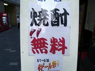 友人から携帯電話に写真付きのメールが届いた。 「焼酎が無料で飲み放題の寿司屋を見つけました。」 にわかには信じられない内容である。 しかし添付されている写真にははっきりと「焼酎無料」と書かれている。 すぐさま僕は「行きます。」と返信した。