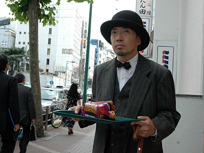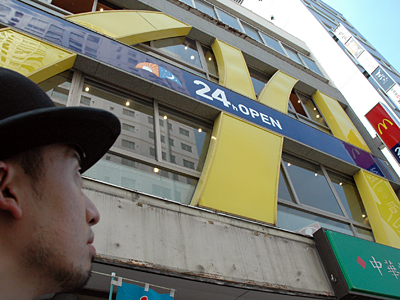 大正スタイルのまま、マクドナルドへ入っていくシーンを撮影し、その映像を横断歩道の時と同じように白黒にして映写機の音をかぶせる。