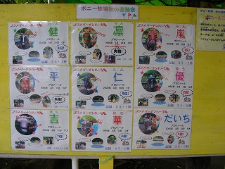 どうしようかと思いながらポニー乗り場に行ってみる。ポニーは何匹もいるらしく、それぞれ名前などが写真入りで丁寧に紹介されている。ここでもフレンドリーだ。