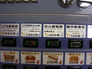 よくわからない応援メッセージに奮い立たされて、ポニーに乗ることを決意。乗馬券には子供や親子用といったものがある他に、たこ焼きなどの券も一緒に販売。