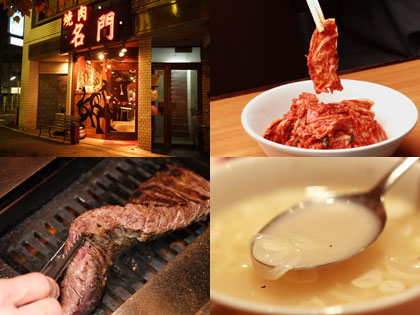 昼間のどんぶり対決が終了し、いよいよディナーは肉料理。小石原さんのおすすめは四谷三丁目の「焼肉 名門」のスーパーホルモン。スーパーホルモンについては何はともあれ左の写真を見てもらったほうが早いだろう。